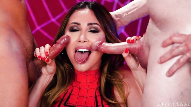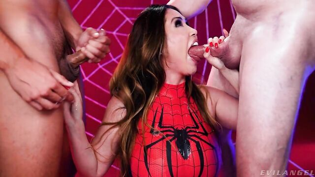 Description:Statuesque, stacked stunner Kianna Dior portrays The Amazing SpiderGirl in a special parody scene for Halloween! The long-haired MILF beauty's skin-tight, red-and-black disguise shows off her big boobs. She takes off her mask, drawing two hard-ons (and the audience) into her web! Hungering to give blowjobs, Kianna kneels between two naked, ready erections. When she's not wetly sucking Jonni Darkko and Jay Smooth's hard boners, she's talking dirty! Kianna swirls her tongue on the tools and strokes the shafts with manicured fingers. Drool runs down her chin. She groans, gurgles and gasps as Jonni's big cock fucks her throat. This BJ superhero deepthroats both dicks, sucks balls and plays with the slobber strands connecting the pricks to her face. Wanting her semen fix, Kianna says, 'Blow your web on my face.' A thick, sloppy double cum facial coats her forehead and fills her eye sockets, dripping onto her tongue and tits. The guys' rods smear jism into her skin and mouth. She swallows sperm, saying her super powers are increasing! A graphic instant replay shows the facial slathering again, close up and in slow-motion!