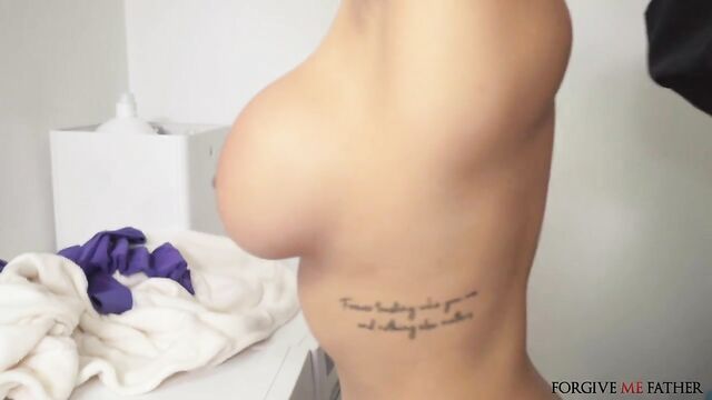 Description:We saw this sexy woman who had very big boobs. I thought she might be a prostitute, so I walked up to her and gave her the details about how I'm not really a priest, but we had money and laptops to give. She asked me to follow her, and led me to a laundry room. She hiked up her dress and pulled her thong to the side to show me she had a butt plug in her asshole. She asked me to take it out and put it back in, then let me face fuck her until she drooled everywhere. I stood her up on the dryer and fucked her doggystyle while she had the butt plug in. She rode my dick and gave me a titwank, then I came on her butt hole... before stuffing the plug back in!