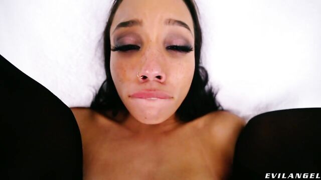Beschreibung: Slender, Black stunner Alexis Tae teases in tight lingerie, smiling seductively as she reveals the butt plug wedged in her asshole. The brazen beauty strips and spreads for the Jonni Darkko's POV camera, ultimately finding herself on her knees before the XXX director. Alexis chokes and slobbers as she sucks his cock, holding a glass below to collect her nasty throat slop. Jonni bends her over and sodomizes her, Alexis moaning through intense anal reaming. Jonni alternates plunging her rectum with a toy and pounding her bunghole with his prick while Alexis spreads her sweet cheeks. The decadent backdoor session serves up rude rectal gaping; a slobbering, ass-to-mouth blowjob; and dick/dildo double penetration! For a hot cum facial finale, Jonni masturbates to orgasm, dripping a messy load of sperm over Alexis' forehead. She gives thanks with a few final sucks and then swallows the surplus.