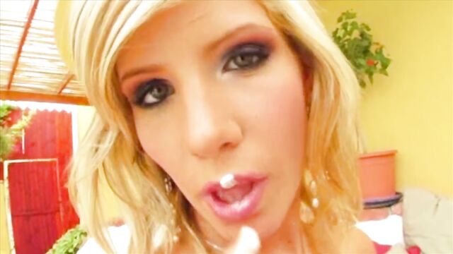 Beschreibung: This pretty little blonde releases her perfect rack from her bra and jiggles her tits up and down. She covers herself in cream and cums.