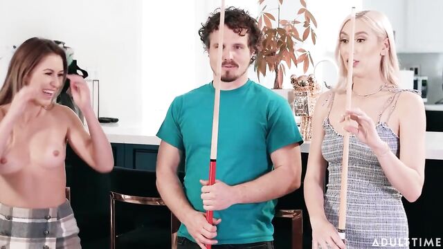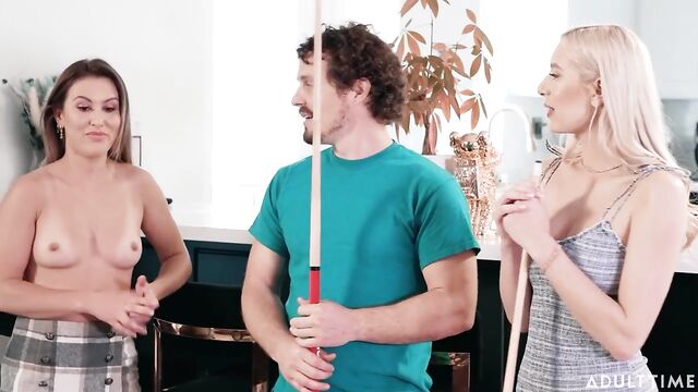 Description:Kay Lovely is playing pool with her date, Robby Echo. Kay's roommate Paige Owens sees them having fun, and asks if she can join in. As the game becomes increasingly competitive, Paige offers to make things more interesting by saying that if she makes the next shot, she gets to take her shirt off. Paige successfully makes the first shot, so she takes her top off... and she's NOT wearing a bra underneath!Kay is surprised, saying she didn't think Paige would actually do that. But Paige says that turning this pool game into 'strip pool' sounds extra fun, so why not? Robby and Kay end up agreeing, so the game continues, and before long Robby ends up losing his pants and then his underwear. Kay suggests that maybe she and Paige should change the game into a competition over Robby's dick, so they start sucking on his dick and balls. Next, the ladies get fully undressed for even MORE fun. Pool is great, but it looks like they've found something better!