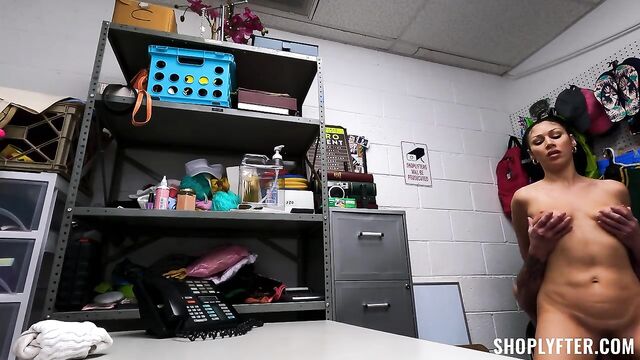 Beschreibung: Queenie is a server at a mall’s sports bars. She’s been caught stealing customer wallets and her manager called the cops on her. Security Guard Jack Vegas has her on tape committing the crime, but to make sure he has solid evidence of the crime, she takes her to his office for questioning and fills her up. Looking for the stolen items, Jack fondles Queenie, making her go mad. Her outrage does not last long, as Jack finds a wallet that’s not hers. This prompts the officer to do a thorough cavity search which involves fingering her pussy to ensure there’s nothing in there. Now feeling fully awkward, Queenie begs for a way out–the words Jack loves to hear. If the hot server can cater to his cock, she might walk away a free woman after all…
