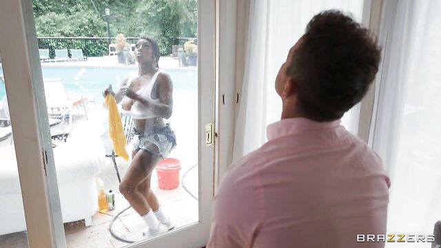 Beschreibung: Sexy big boobed window cleaner Ebony Mystique gets wet and puts on a show for her client Van Wylde. Van jerks off and cums all over the glass door. When Ebony spots this impossible to clean spot, she enters for a closer look, realizes it's cum and, much to Van’s surprised, is thrilled! She licks up the cum before taking care of Van's big dick!