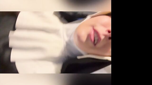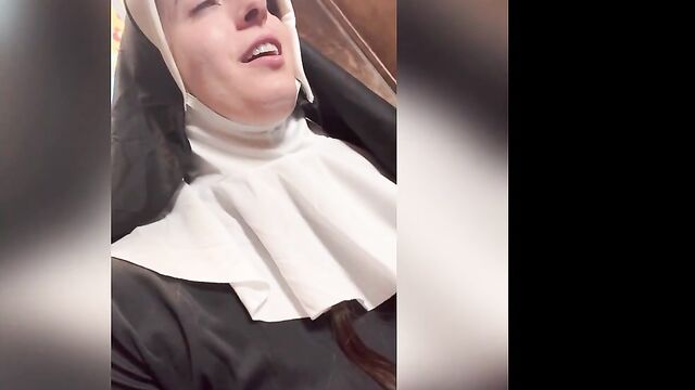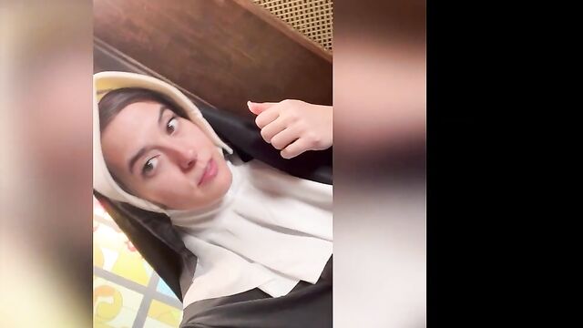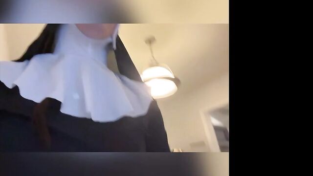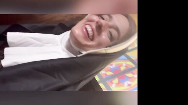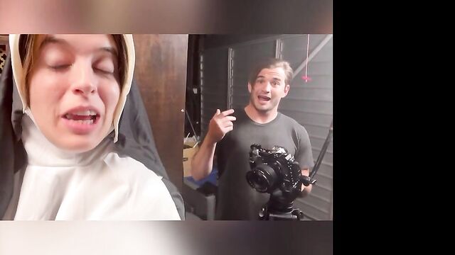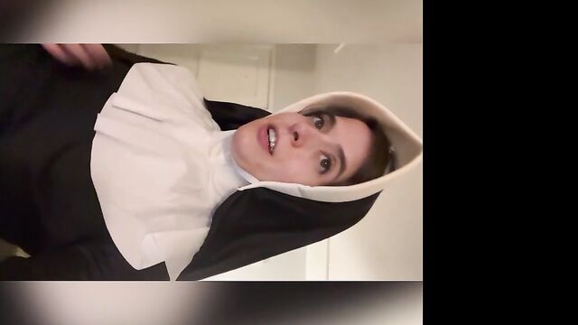 Description:Abbie Maley came to visit Able Godshark randomly. She is loving her hair today and she keeps on babbling about how she doesn't have any good clothes wear. Able is done cleaning up around the apartment and comes up behind her. He leans his throbbing cock on her asscheeks and starts playing with her small tits. The brunette slut teases him by starting to wiggle her ass around. Able removes his boxers and inserts his cock into Abbie. He makes her drop her core to the floor and keeps fucking her in doggy style. They're in a hurry, so Abbie will quickly turn around to thank Able with a nice blowjob. Abbie tries to call Nathan Bronson but he denies her phone call. Able doesn't seem surprised. She tries to facetime him. He picks up this time. She tells him there's no need for him to hurry, because Able had already fucked he came. Nathan sounds upset, but Able and Abbie quickly revealed they were joking. Nathan is on his way eager to kick Able in the butthole. Abbie had to follow up with "That's super gay, I like it". Nathan is also bringing a cameraman. Abbie is wondering if he's cute too. Nathan arrives and only a few moments pass before Abbie is sucking his cock. Able and Nathan then start preparing her for filming. She is going to be a nun today! When she's all ready, they take her to the set. She poses for the camera as they direct her. Then she lifts up her long skirt and starts rubbing her clit!
