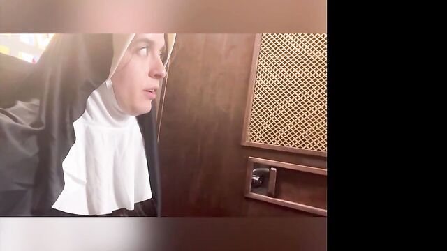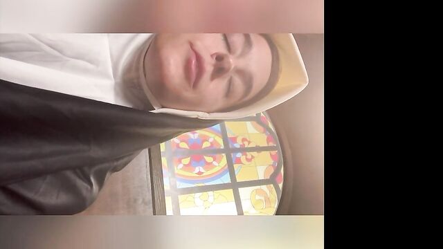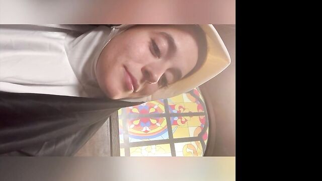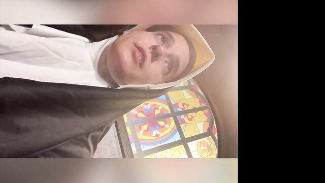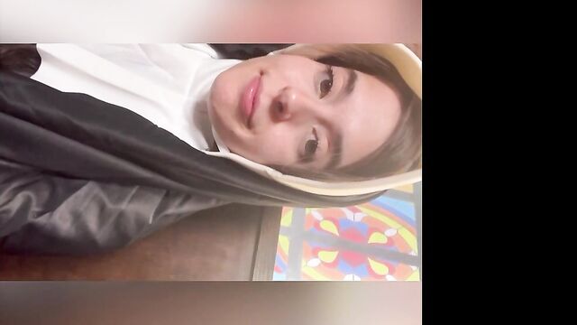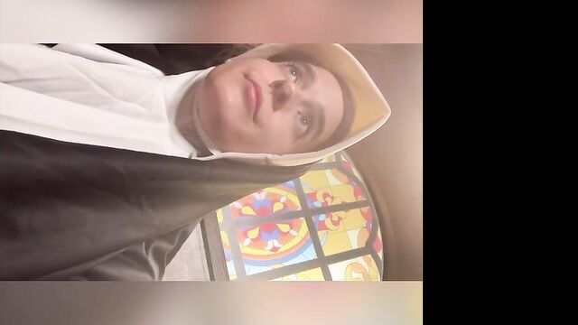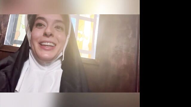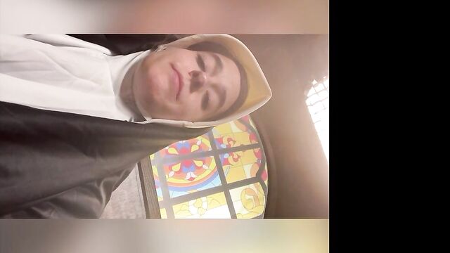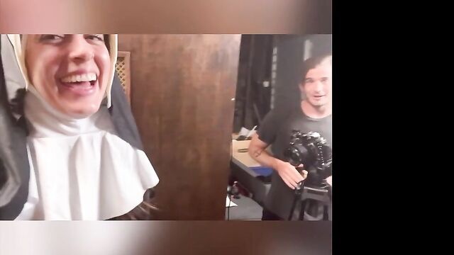 Beschreibung: Abbie Maley came to visit Able Godshark randomly. She is loving her hair today and she keeps on babbling about how she doesn't have any good clothes wear. Able is done cleaning up around the apartment and comes up behind her. He leans his throbbing cock on her asscheeks and starts playing with her small tits. The brunette slut teases him by starting to wiggle her ass around. Able removes his boxers and inserts his cock into Abbie. He makes her drop her core to the floor and keeps fucking her in doggy style. They're in a hurry, so Abbie will quickly turn around to thank Able with a nice blowjob. Abbie tries to call Nathan Bronson but he denies her phone call. Able doesn't seem surprised. She tries to facetime him. He picks up this time. She tells him there's no need for him to hurry, because Able had already fucked he came. Nathan sounds upset, but Able and Abbie quickly revealed they were joking. Nathan is on his way eager to kick Able in the butthole. Abbie had to follow up with "That's super gay, I like it". Nathan is also bringing a cameraman. Abbie is wondering if he's cute too. Nathan arrives and only a few moments pass before Abbie is sucking his cock. Able and Nathan then start preparing her for filming. She is going to be a nun today! When she's all ready, they take her to the set. She poses for the camera as they direct her. Then she lifts up her long skirt and starts rubbing her clit!