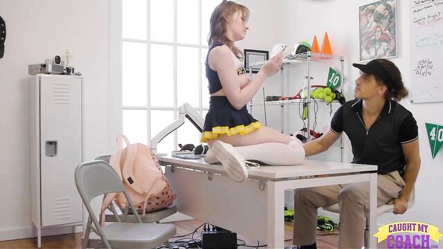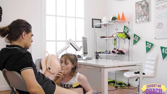 Description:Bruce Venture is running a tight schedule but he still has to see his cheerleader Melody Marks. Melody is wearing an outfit that she made herself. It’s super inappropriate so Coach has no choice but to send Melody home. Bruce has to leave the room for a moment to get a detention slip, so Melody peels off her panties and climbs on Coach’s desk. When he sits down again, Melody begins snapping sexy photos of her tits and pussy with Bruce in the background.Knowing she’s in charge, Melody instructs Bruce to come sit on the other side of her desk and eat her pussy. Coach does as he’s told, licking her from fuck hole to clit and then continuing when Melody gets on her knees. Melody puts her feet back on the ground so Bruce can line up the shot and then shove himself into her tight little pussy.Melody isn’t done with Coach yet. She climbs onto his lap so she can ride him, first in reverse cowgirl and then in cowgirl. Dropping to her knees, Melody sucks her juices off the D and then returns to the desk. This time when Melody is on her back, Bruce doesn’t hesitate to go as far inside as that snatch can handle. He pulls out to cum on Melody’s landing strip and then tells her to get dressed and get back to practice.