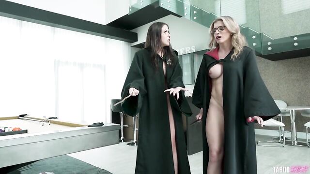 Beschreibung: Amiee Cambridge is wearing a green and black wizard robe while Cory Chase is wearing a red and black wizard robe, as they sit on the couch chatting. 'Life is so boring! Why don't you do that spell on me again?' Cory suggests. Amiee points her wand at Cory's pussy and suddenly Cory's pussy starts to squirt. Cory points her wand at Amiee's pussy and the same thing happens to Amiee! Now that the two MILF's are turned on, Amiee spreads her legs and Cory starts to eat Amiee's pussy out. Cory rubs her own pussy while she licks and sucks Amiee's clit. She continues to eat her step-sister's pussy out until she cums hard in her mouth! The two MILF's switch places and Amiee starts to passionately eat Cory's pussy out next. After Cory cums, the two MILF's start to scissor each other until they both cum again! Dark Magic-A cloud of purple smoke appears, and suddenly Jonathan Jordan magically comes into sight. 'I smell wizarding MILF sluts! Let's battle!' Jonathan exclaims, before he disappears just as fast as he appeared. When he reappears, he is inside standing behind Amiee Cambridge and Cory Chase. The two MILF's hold their wands towards Jonathan while they chant a magical phrase. None of their magic seems to be working against Jonathan. They both decided to give him a blowjob instead, and they can't seem to get enough of his cock! Amiee and Cory both sit down next to each other and they spread their legs wide open. Jonathan walks over to Cory first and he fucks her pussy with his big cock. A few minutes later, he moves over towards Amiee's pussy and he starts to fuck her next. Amiee flips over into the doggystyle position and Cory spits on her pussy so Jonathan's cock can easily slide back in. 'Give me that dark magic!' Amiee moans. Slutty Wizards Left Destroyed-Jonathan hops up on the bed and Cory and Amiee follow him. It doesn't take long before they pull his huge cock out and they start to give him a double blowjob. Once his cock is nice and hard, Cory climbs on top of Jonathan and she starts to ride his cock in the cowgirl position. A few minutes later, Cory slides off and Amiee hops on top of Jonathan's cock next. Amiee bounces up and down on Jonathan's BBC while Cory stands next to them, watching. Cory and Aimee switch places again, and Cory starts to ride his cock in the reverse cowgirl position next. Then, the two MILF's lick his cock clean before he starts to fuck Amiee's pussy in the doggystyle position. While he is fucking Amiee from behind, Amiee and Cory are making out with each other simultaneously. Jonathan continues to fuck Amiee's pussy until she cums hard on his cock. Amiee flips over on to her back and Jonathan continues to fuck her pussy in the missionary position next. At the same time, Cory climbs on top of Amiee and she sits down on her face. Cory lies down in the missionary position and Jonathan starts to fuck her pussy again. When Jonathan is ready to cum, he jerks his cock off into Amiee's mouth and all over her face! Then, Cory starts to kiss Amiee's face so the two MILF's can swap his cum... Afterwards, Jonathan puts a crucifix pain spell called Crucio on both of the MILF's! This will leave the MILF's to have orgasm after orgasm for eternity...
