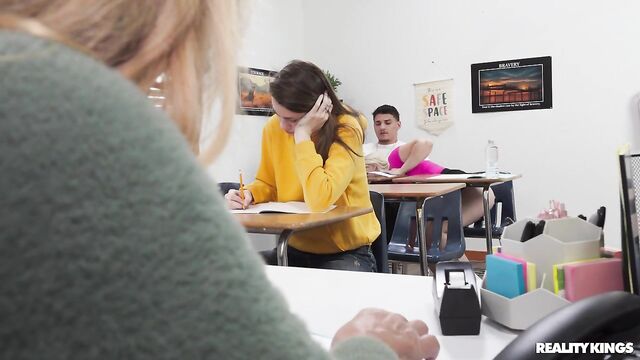 Beschreibung: It's exam day, but the only thing blonde college girl Maisey Monroe wants to study is her classmate Victor Ray's anatomy. Maisey taps him on the shoulder and flashes him her big natural tits when he turns around, then "accidentally" drops her pencil so he'll get a look at her fingering her shaved pussy under the desk when he picks it up! Victor moves to sit next to her, and Maisey sneakily sucks his cock, then starts riding it. Their professor tries to tell them to stop, but they lock her out of the room so they can fuck on her desk!