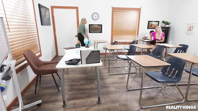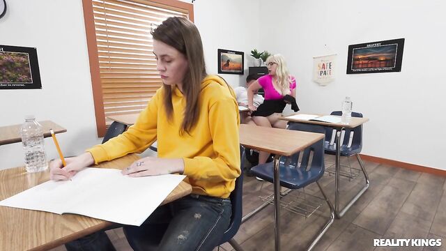 Description:It's exam day, but the only thing blonde college girl Maisey Monroe wants to study is her classmate Victor Ray's anatomy. Maisey taps him on the shoulder and flashes him her big natural tits when he turns around, then "accidentally" drops her pencil so he'll get a look at her fingering her shaved pussy under the desk when he picks it up! Victor moves to sit next to her, and Maisey sneakily sucks his cock, then starts riding it. Their professor tries to tell them to stop, but they lock her out of the room so they can fuck on her desk!