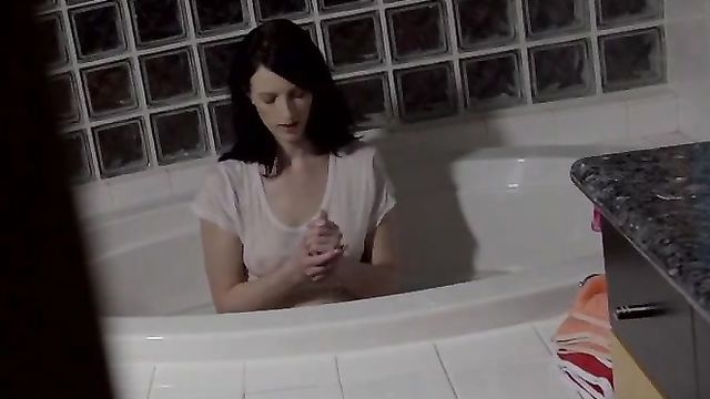 Description:Horny cute student Alex Harper sends her boyfriend Brian Omally naughty pictures of her fair skinned boobs with their perky pink nipples and her tight twat with her panties pulled high into her crotch. She just can't wait for Brian to join her, so she relocates to the bathroom to slip into the bathtub where her tight white shirt gets wet and translucent. Brian walks in on her playing with her dripping tits and rubbing her tender pussy beneath her underwear. Whipping out Brian's stiffie, Alex strokes his shaft for a few moments. Then she leans forward and puts her mouth to work sucking him off. Once he's nice and hard, Alex climbs out of the tub and turns around so that she can impale herself on her boyfriend's fuck stick. Her landing strip fuck hole throbs with delight as she pumps her hips, and then even more when she turns around to face Brian as she continues her ride. Settling herself on the edge of the bathtub, Alex spreads her thighs wide so that Brian can continue working her juicy twat. Her moans of pleasure fill the room, and the pulsing of her pussy brings Brian right to the edge. He pulls out just in time to shower Alex's trimmed mound with jizz, leaving her a present to lick from her fingertips.