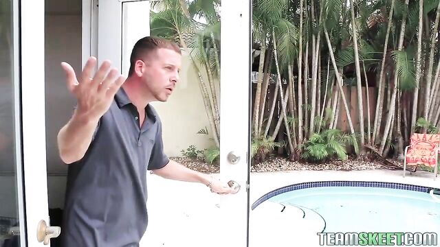 Description:Kimmy Granger is a bad girl. She sneaks into her neighbors backyard to use his pool and to tan in his backyard while hes at work, but today it didnt go as planned. The neighbor forgot his wallet so he came back home to get it when he saw perfect Kimmy laying nude in his backyard! He went outback and was pissed that she was trespassing and she couldnt stop apologizing - she offered to do whatever it takes for him to not call the cops or tell her parents! Kimmy showed him her perky tits and her perfect pink pussy and that was enough to persuade him. He took out his big stick and she showed him how good she is at giving head! They took it inside where he drilled her tight teeny pussy making her moan and cum! He bent Kimmy over destroyed her 18 year old twat, making her cum on his huge rod one last time before he shot his load all over her beautiful face! Tell us what you think of Kimmy in the comments below.