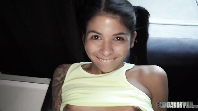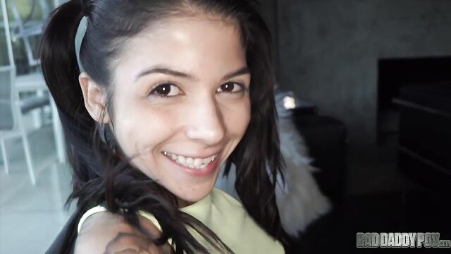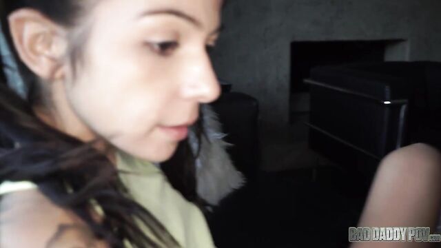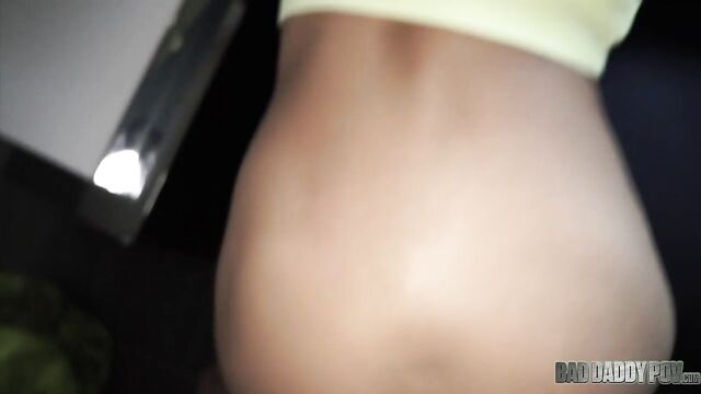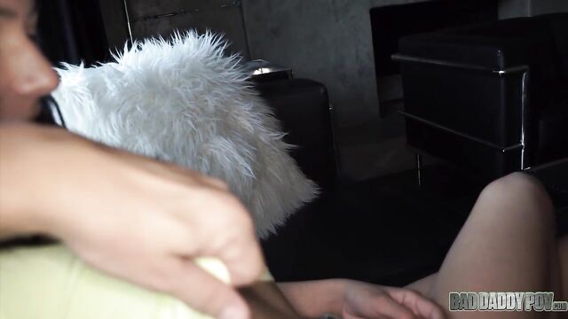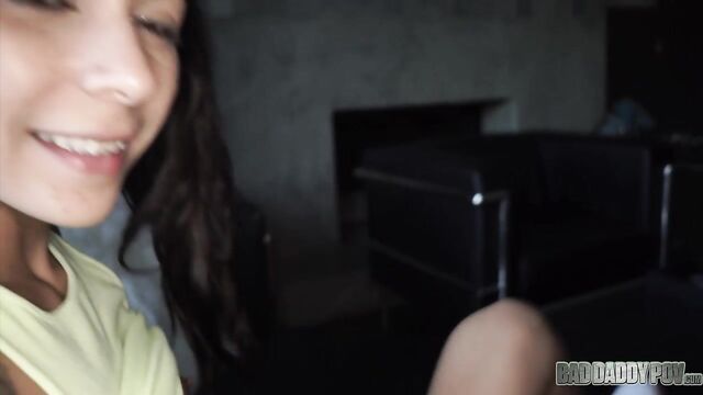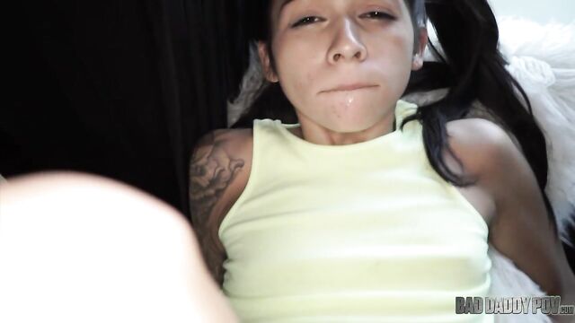 Description:Petite teen brunette Sadie Pop approaches her step-father on the living room. She is wearing a yellow shirt and denim shorts. The two of them are alone in the house because her mom goes to get grocery. Her step-daddy starts to touch her body. He seduces her with his hard cock, telling her that he could teach her a thing or two about pleasuring boys. He guides her hand to his crotch. Sadie is a little reluctant but her step-father is so insistent. Sadie stands up and removes all her clothes. Her little tits and tiny pussy become visible in the camera. He makes her sit on the couch while he pushes his dick to her young face. Sadie licks and sucks his dick like a Popsicle. Sadie slides her step-daddy’s cock in and out of her tiny mouth. She tries to fit the whole shaft into her mouth but gags every time the tip of his penis touches the back of her throat. Sadie gives him a sloppy blowjob for a while before lying on her back. Her step-father stuffs his big cock into her wet cunt. His huge dick stretches her tight little pussy. He can feel her pussy lips wrap tighter around his dong. He keeps pounding her pussy. Sadie begs her step-daddy to fuck her harder while rubbing her clitoris. They continue to fuck in missionary position before he turns her around to rail her from behind. Her tiny butt bounces on his crotch. She can feel her step-dad’s dick go deeper and deeper inside her pussy. Sadie looks back at her step-father. Her eyes look like they are begging for more hard banging. He sits on the couch, letting little Sadie sit on his lap. She begins to grind her hips on top of his crotch. His dick churns the insides of her vagina. He fucks her in missionary position until he feels like he is about to cum. He pulls out his cock from her cunt then lets her stroke and suck it. Sadie continues to blow his cock until he shoots his cum all over her hair. Sadie runs to the bathroom to wash her hair.