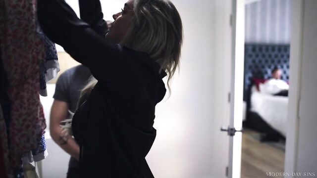 Description:Kali Roses is happily rolling around in bed with her lover, Nathan Bronson, but their joy is short-lived when they hear Kali's boyfriend, Johnny Goodluck, arriving home earlier than expected. Kali and Nathan are both shocked as they try to figure out what they're going to do, which leads to Kali pushing Nathan into the closet, out of sight.When Johnny enters the bedroom, it's revealed that he's been sent to work from home that day after a mishap. As he settles onto the bed with his laptop to catch up, he's unaware that he's a mere few feet away from Nathan, who is trying his best to be quiet. But being so sneaky right under her boyfriend's nose seems to be a huge turn on for Kali, as she begins sneaking back into the closet to steal kisses from Nathan whenever she has a chance. Feeling emboldened, this turns into Kali getting onto her knees and sucking Nathan's cock as well.Eventually, Johnny steps too close for comfort to the closet and Kali intercepts him. Of course, now that her back is turned, it's Nathan's turn to be the naughty one while fucking her from behind. It's clear that playing with fire like this is exciting for BOTH of them, but if they're not careful, they could get burned...